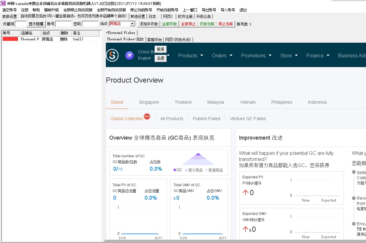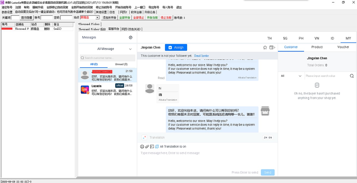 软件支持Lazada跨境店和本土店,可以自动翻译客户发过来的消息再匹配回复规则,自动发出的消息lazada平台自己已经可以自动翻译,无需软件翻译。