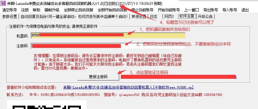 4. 运行后,点“软件注册”,把机器码复制并发送给我们,我们会把注册码发给你,只要把注册码复制到软件里,点“更新注册码”,即可完成注册