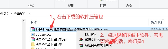2. 解压缩:右键点击“虾聊-Shopee虾皮多店铺后台多客服自动聊天机器人.rar“,左键点击”释放/解压到这里“,如果需要密码的话,密码是:1
